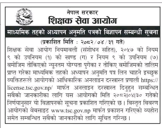 शिक्षक सेवा आयोगले माध्यमिक तहको लाइसेन्सको विज्ञापन प्रकाशित गरेको छ ।आज शनिबार शिक्षक सेवा आयोगले माध्यमिक तहको लाइसेन्सको विज्ञापन सम्बन्धीत सूचना प्रकाशित गरेको हाे।