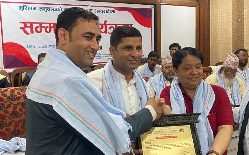 नेपालगञ्ज । मुस्लिम जर्नलिस्ट क्लब नेपालले बिहिबार नेपालगञ्जमा आयोजना गरेको एक बृहत्त कार्यक्रमका बिच बाँकेका सातजना वरिष्ठ व्यक्तित्वलाई अन्तर्राष्ट्रिय सेवा सम्मानबाट सम्मानित गरिएको छ । ‘मुस्लिम समुदायको सवाल विषयक अन्तरक्रिया र सम्मान कार्यक्रम’ मा सो सम्मान प्रदान गर्नुका साथै बाँकेमा विजयी भएका १३० जना मुस्लिम जनप्रतिनिधिहरुका साथै दलहरुमा जिम्मेवारी पाएका मुस्लिमहरुलाईलाई मायाको चिनो प्रदान गरेर सम्मानित गरिएको मुस्लिम जर्नलिस्ट क्लब नेपालका अध्यक्ष आलम खानले बताउनुभयो ।